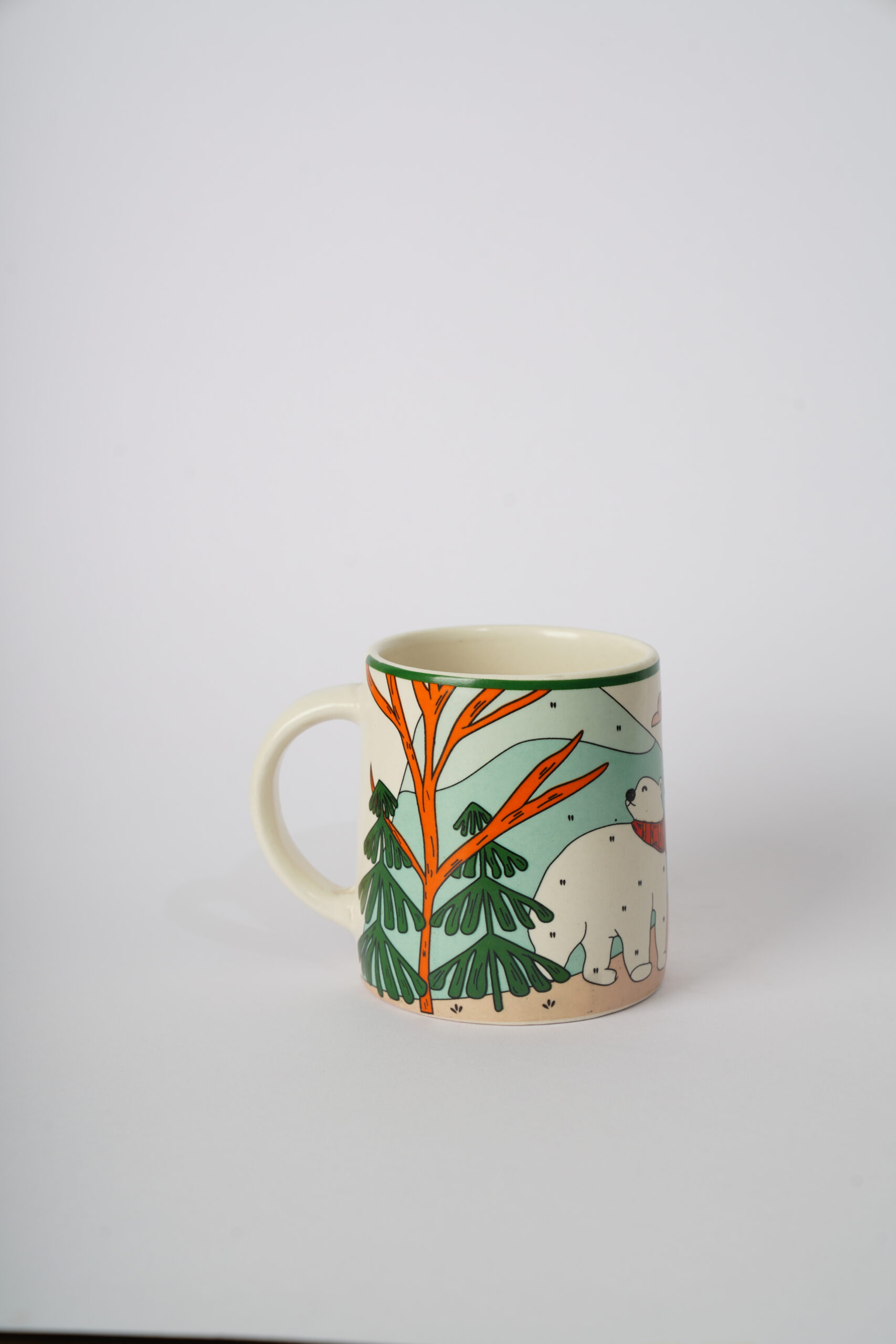 A charming winter-themed ceramic mug featuring a polar bear strolling through a snowy forest.
