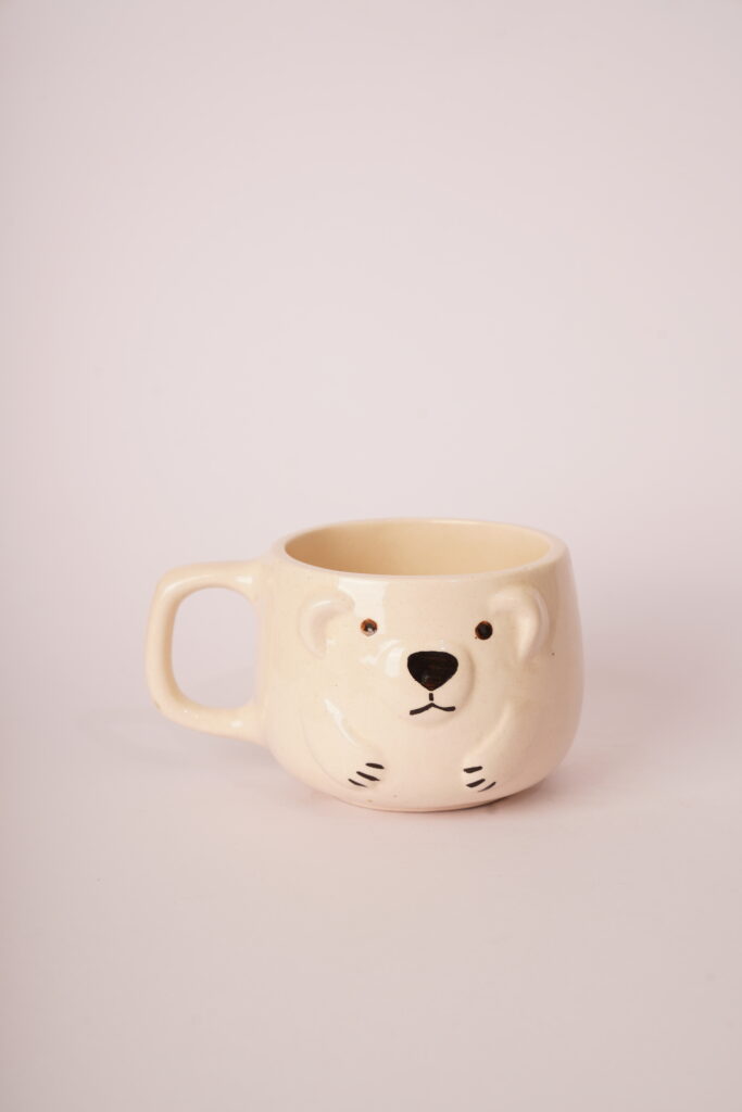 Beige ceramic mug with a 3D bear face and hand-painted features.