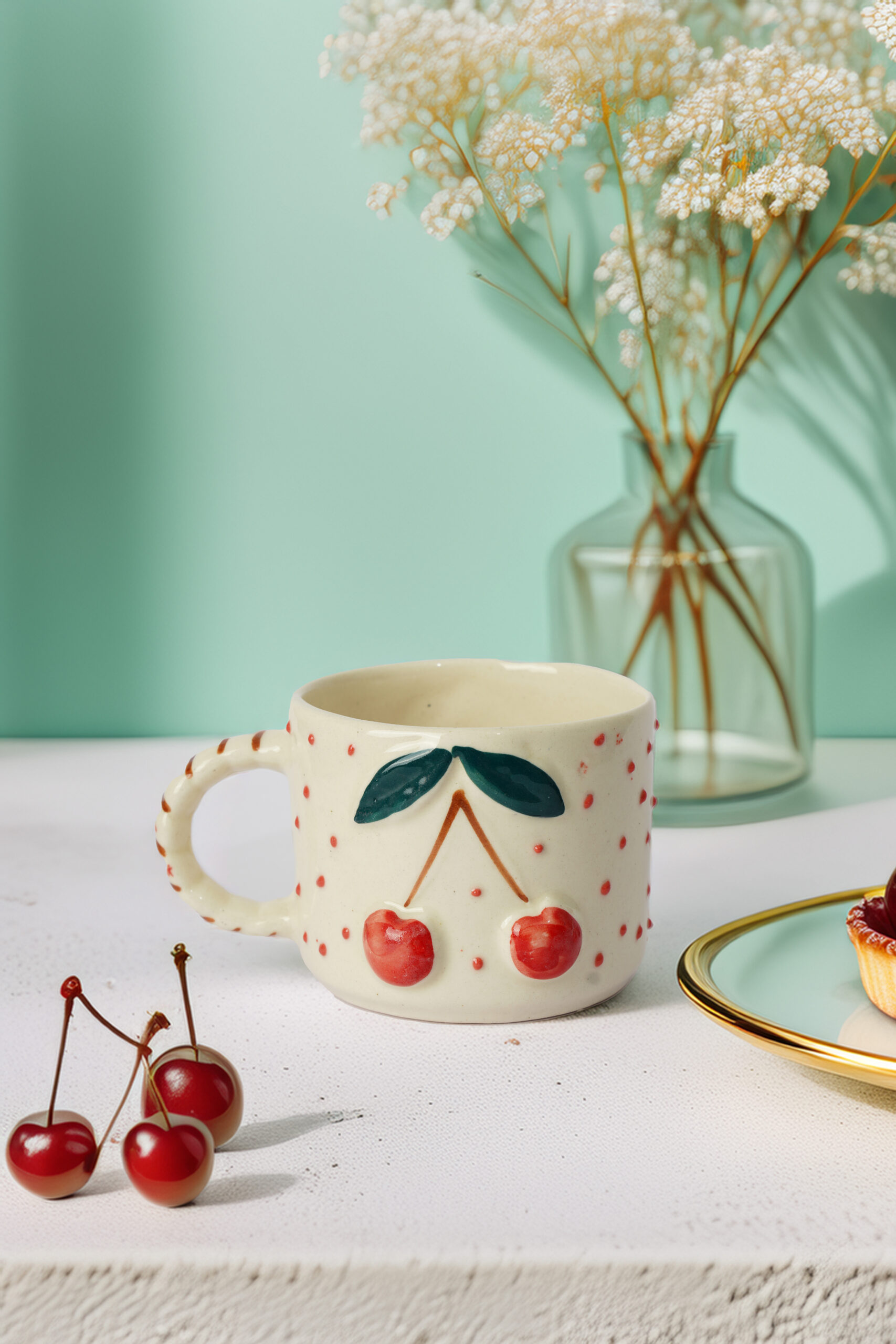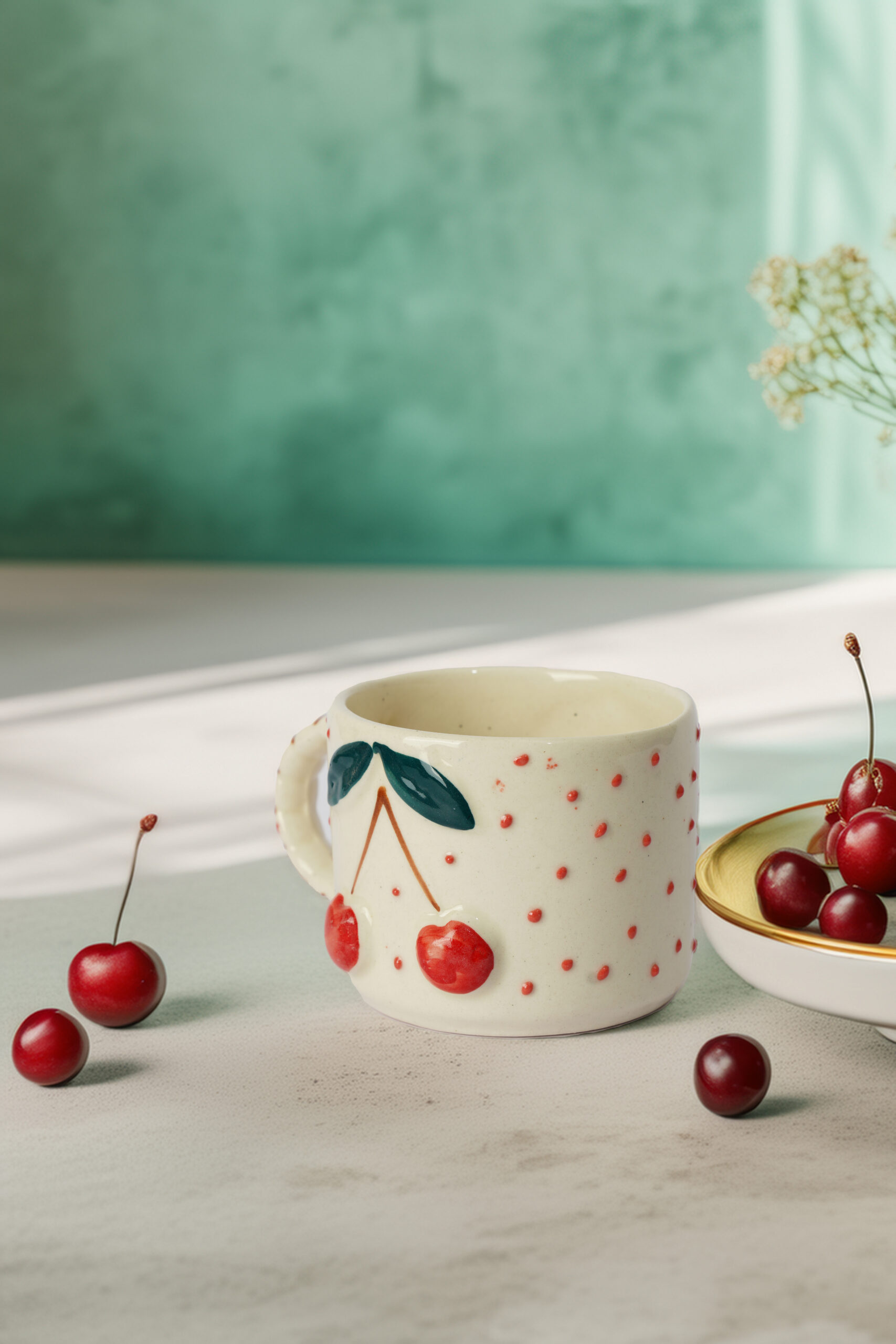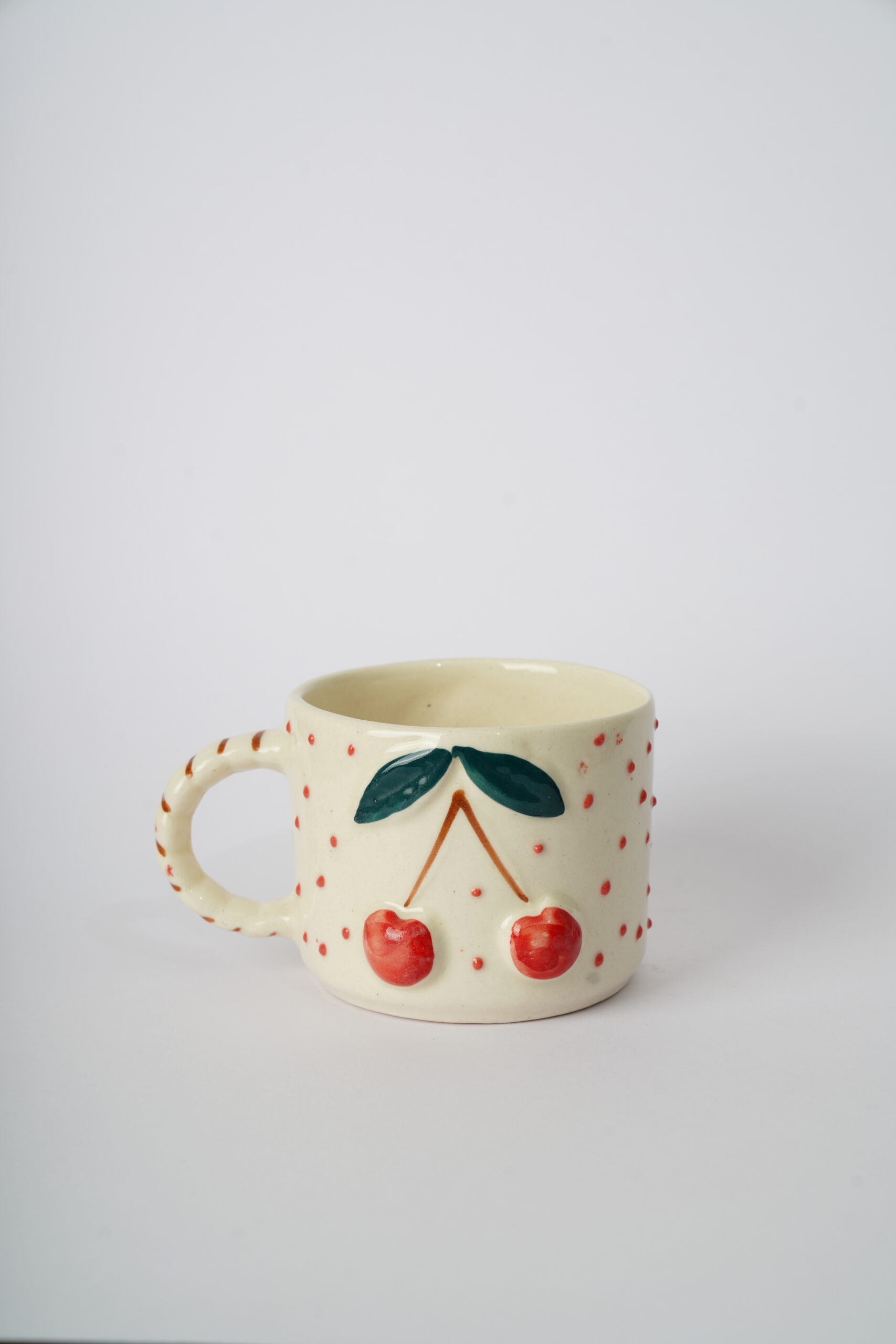 Brighten up your mornings with the Cherry Whimsy Mug, a playful piece bursting with charm. Crafted from creamy ceramic, this mug features a vibrant pair of embossed red cherries with green leaves, centered between cheerful red speckles. The handle, subtly striped for added flair, is shaped for a cozy grip. Ideal for serving tea, coffee, or a splash of joy, this mug adds a fruity twist to your collection.