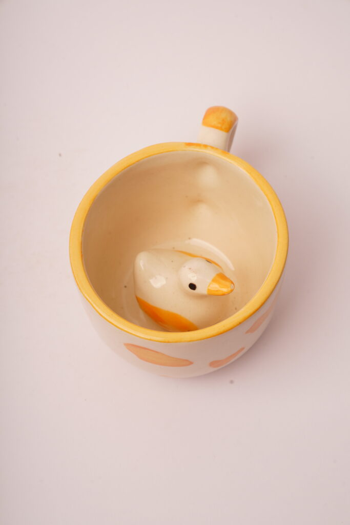 Add a splash of joy to your day with the Duckling Surprise Mug. Featuring sunny yellow feather accents on the outside and a 3D duck nestled at the bottom inside, this cream ceramic mug brings playful delight to every drink. The yellow handle and rim complement the duck’s beak and feather tones, creating a cohesive and heartwarming design. Perfect for bird lovers, children, or those who enjoy a little surprise with their sip. Microwave- and dishwasher-safe for easy, everyday use.