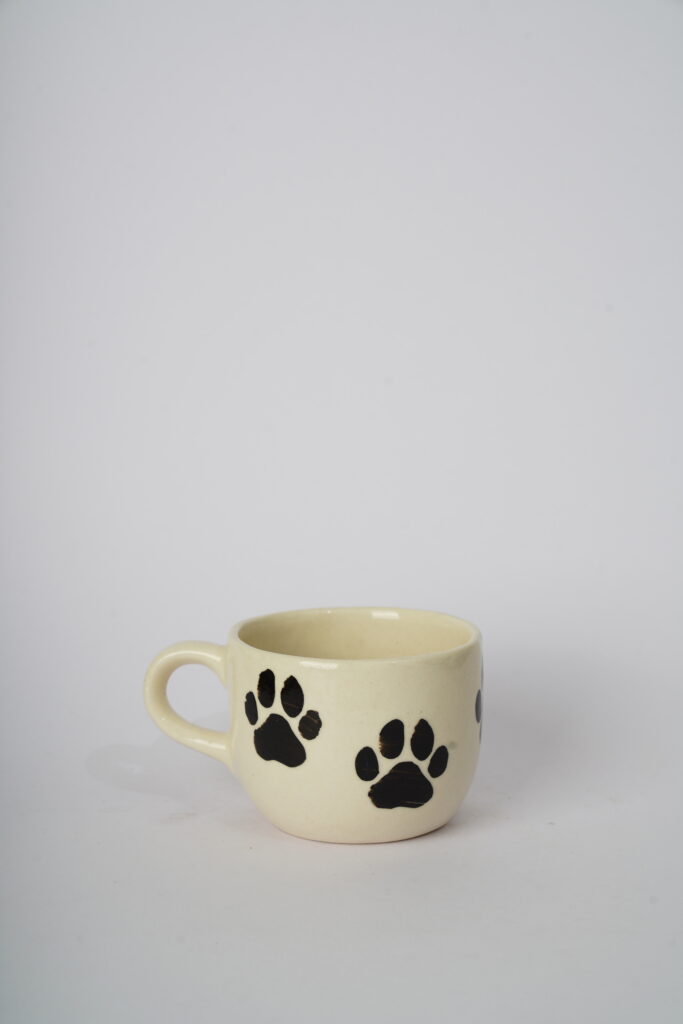 Cream ceramic mug featuring dark gray paw prints and a hidden 3D spotted dog figurine inside.