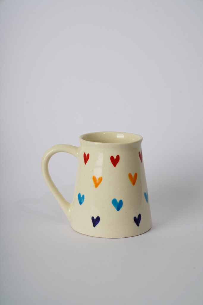 Brighten up your mornings with the Rainbow Hearts Mug – a delightful piece designed to bring a pop of color and love to your drinkware collection. Featuring vibrant hearts in hues of red, orange, blue, and navy on a creamy backdrop, this wide-bottomed mug stands out with its modern silhouette and playful charm. A perfect choice for tea, coffee, or gifting a little heart to someone special.
